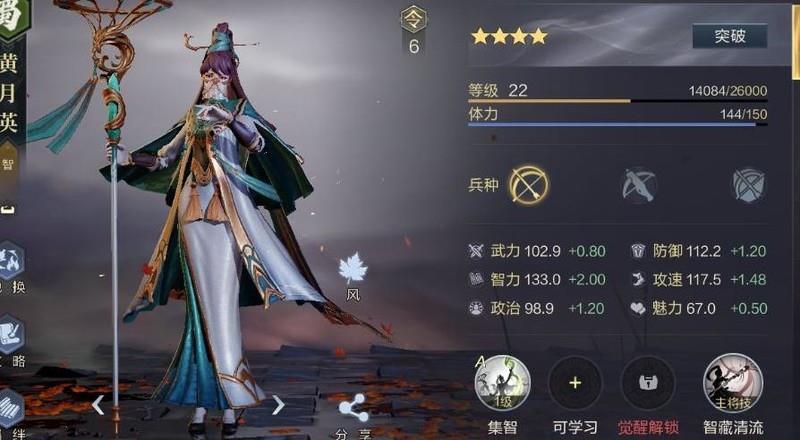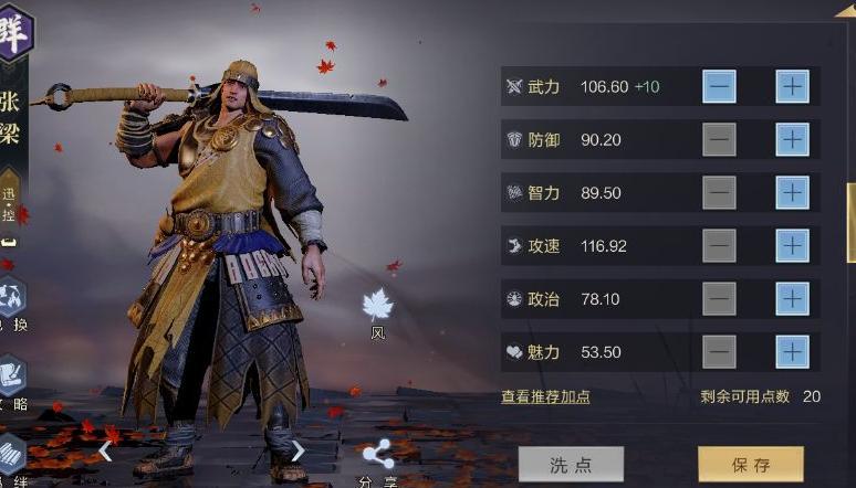 武将每提升10级可获得10点属性点,智力、武力、防御均可自由分配,具体取决于主公所搭配的第二技能。例如黄月英提升智力,张梁增强武力。前期不建议为武将配备连击类战法或加点攻速,因连击效果此前已被大幅削弱。