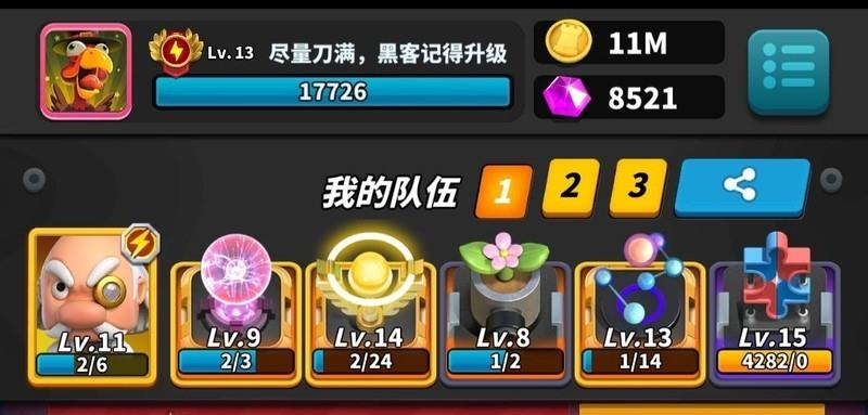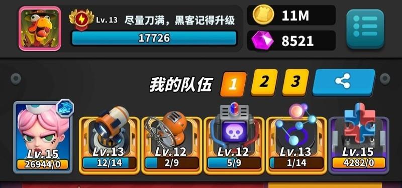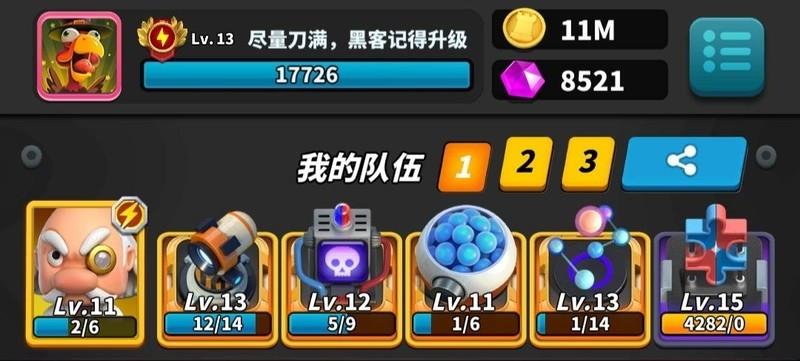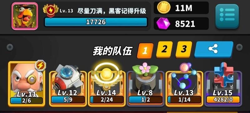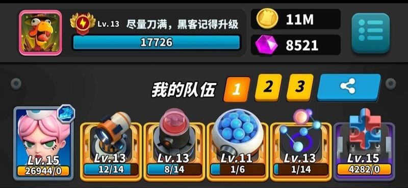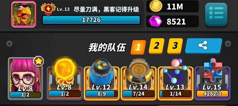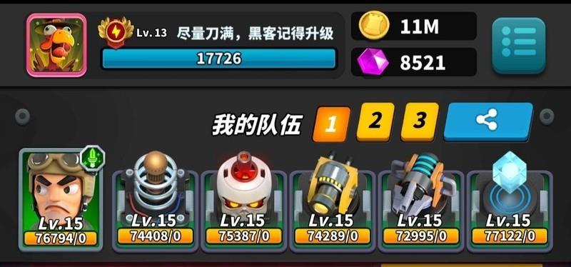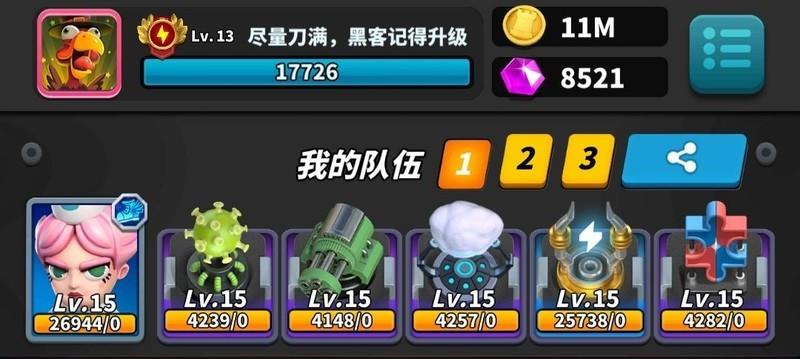 玩法要点:激光需升至13级,分裂与黑客各升11级。开局专注分裂,迅速铺满屏幕,主动让对手攻击三回合,利用高阶激光压制对方。从第四回合起全力叠加黑客技能,直至充满。通常未完全释放能量便已取胜,操作简洁高效,资源利用率高,堪称平民玩家最强阵容组合,无需高氪也能强势登顶。