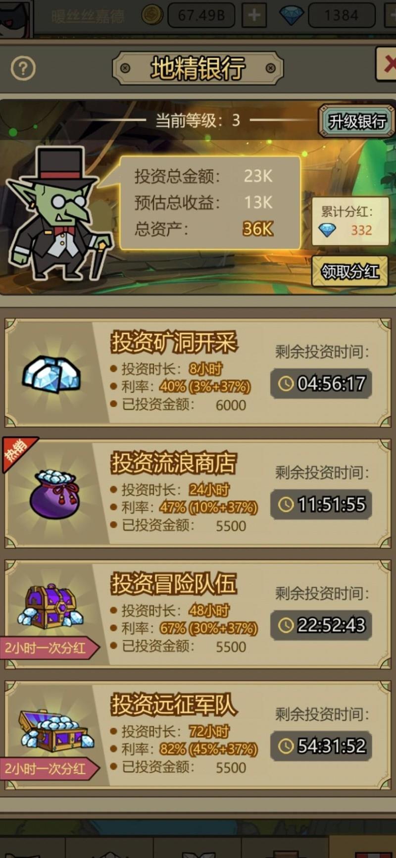 开局先别急着使用钻石,领取全部兑换码后继续推进关卡,很快就能解锁地精银行。一级地精银行最多可存两万钻石,到期返还三万多,净赚超一万。每日还可领取固定钻石,开启后形成稳定收益循环,积累速度越来越快,钻石供应源源不断,后期使用毫无压力。