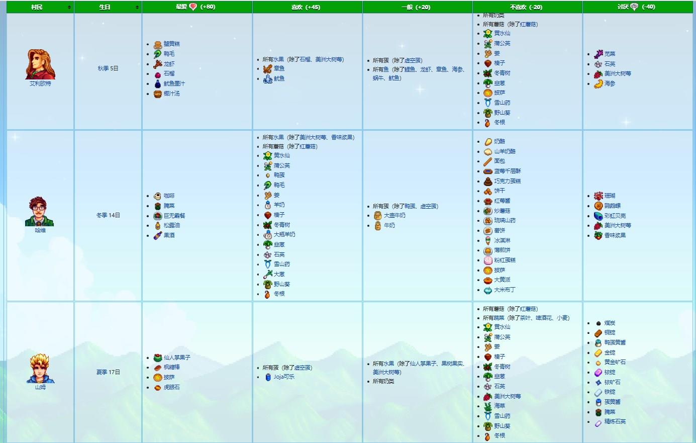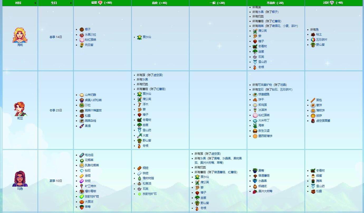 星露谷物语人物喜好列表