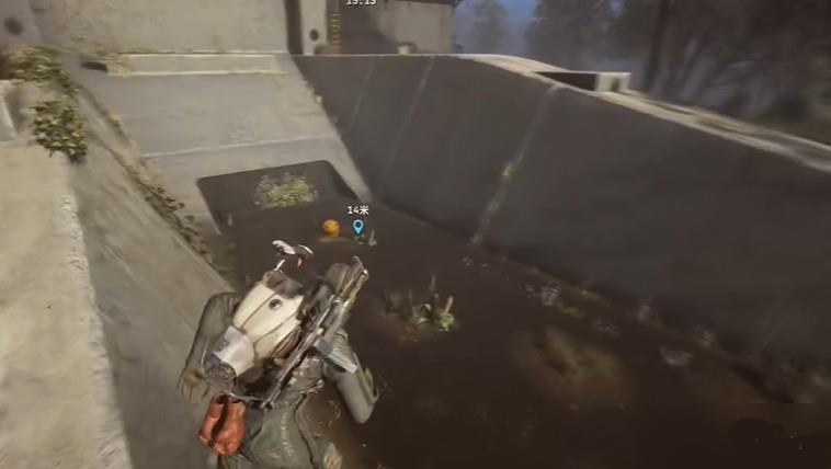从缺口跳下落地后,地面有碎石堆。立刻靠右侧移动(左侧有地形陷阱容易卡住或扣血),前进约15米就能在墙上找到目标阀门,是一个银色的阀门,带有红色的旋转把手。当你靠近时,它会有高亮提示,非常容易辨认。