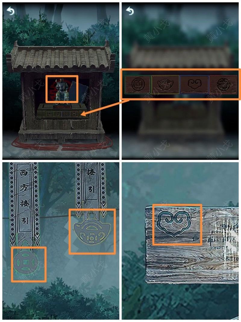 点击神像下方的盒子,按照提示的颜色顺序(绿色、黄色、蓝色、红色),参考神像后方、路牌以及招魂幡下的符号与颜色,调整出正确的符号组合。