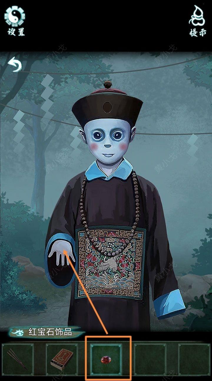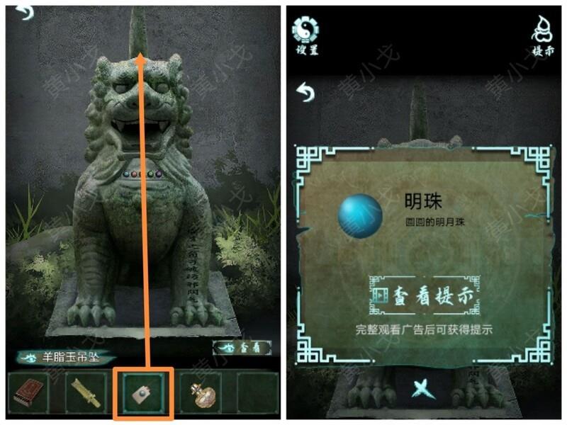 21. 点击石像,使用擦拭灰尘;再点击上方彩色珠子机关,根据牌匾提示(魍对应紫色、魉对应红色),结合房梁灯笼和柱子刻字的线索,调整密码锁颜色顺序为:蓝色(魑)、红色(魉)、橙色(魈)、绿色(魆)、紫色(魍),并注意灯笼角度与斜杠方向一致。