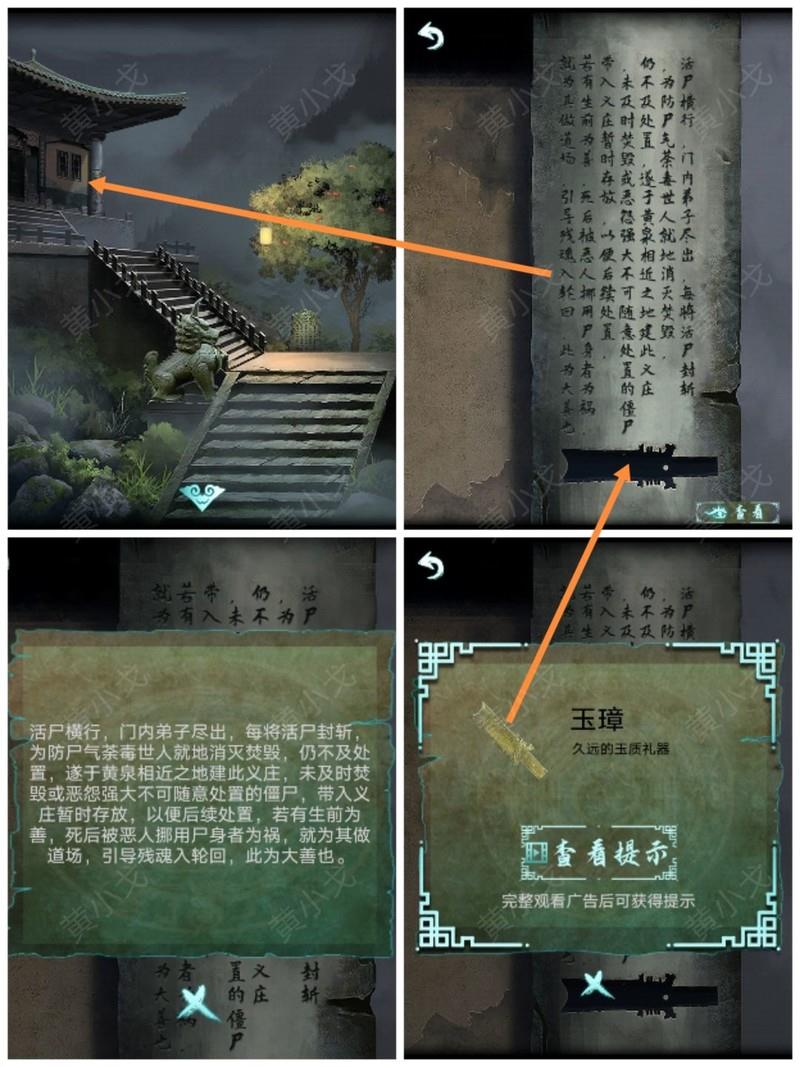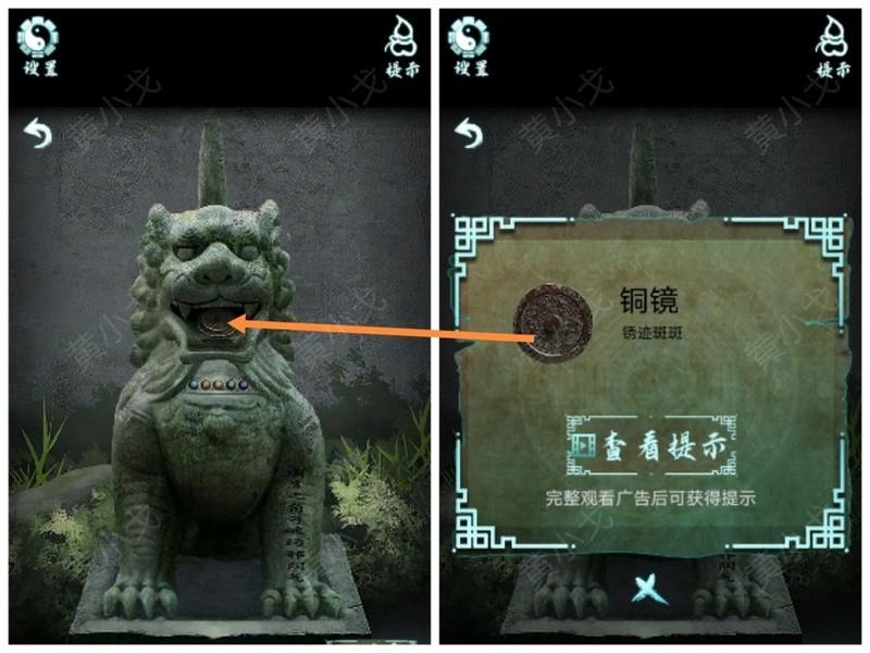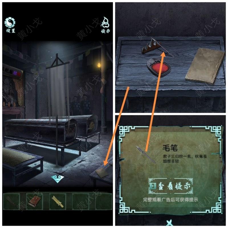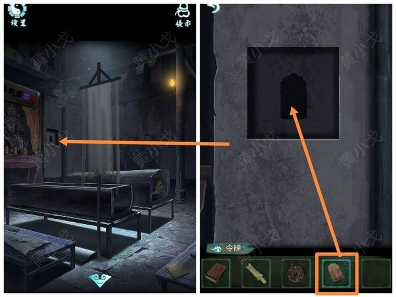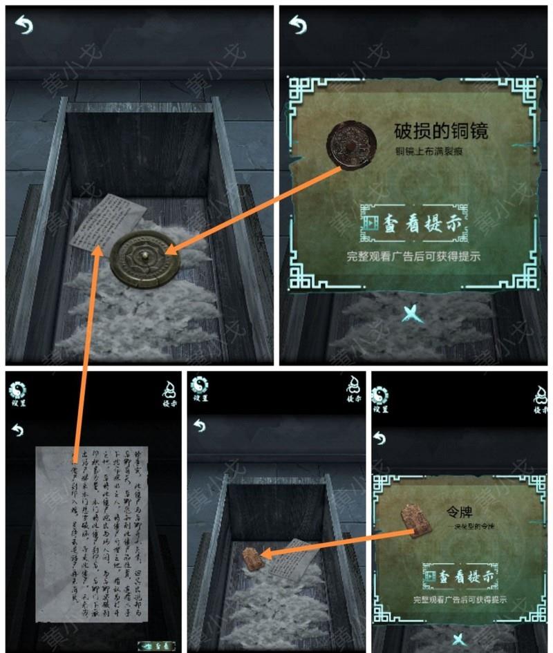 点击棺材获取破损铜镜,查看纸条后在下方取得令牌。