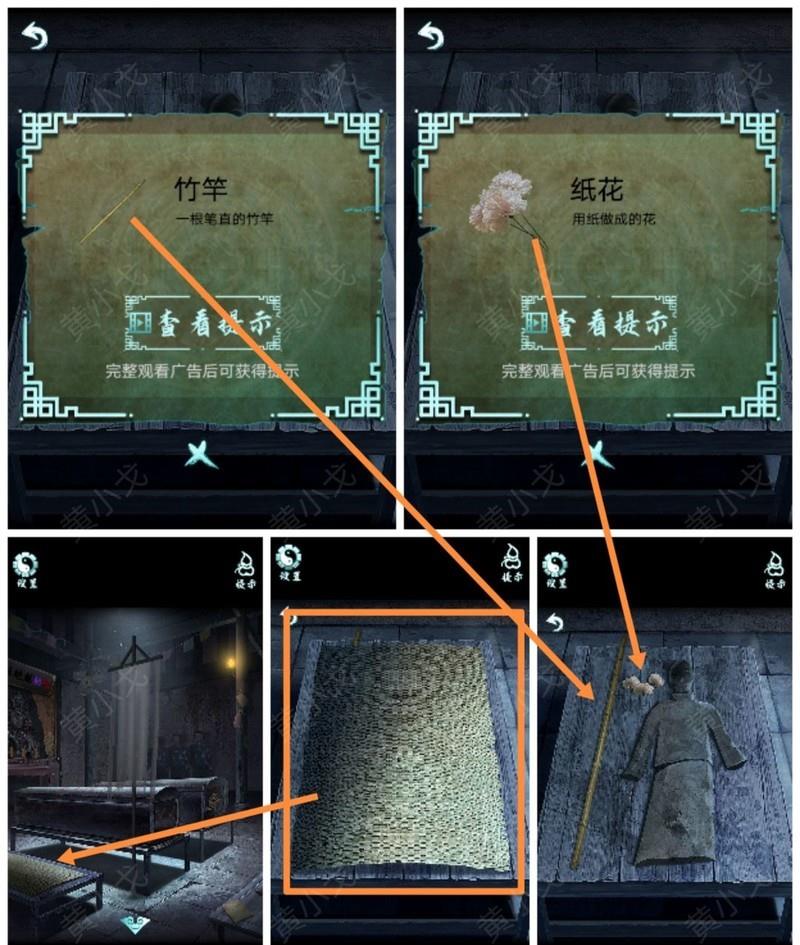点击左侧桌子,掀开布,获取竹竿和纸花。