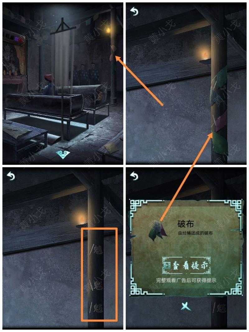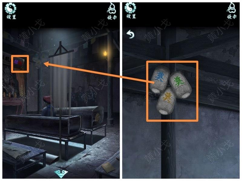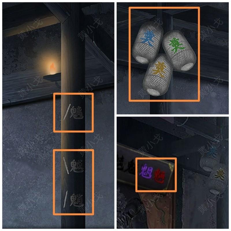 查看房梁灯笼,注意牌匾文字与颜色:魍为紫色,魉为红色。
