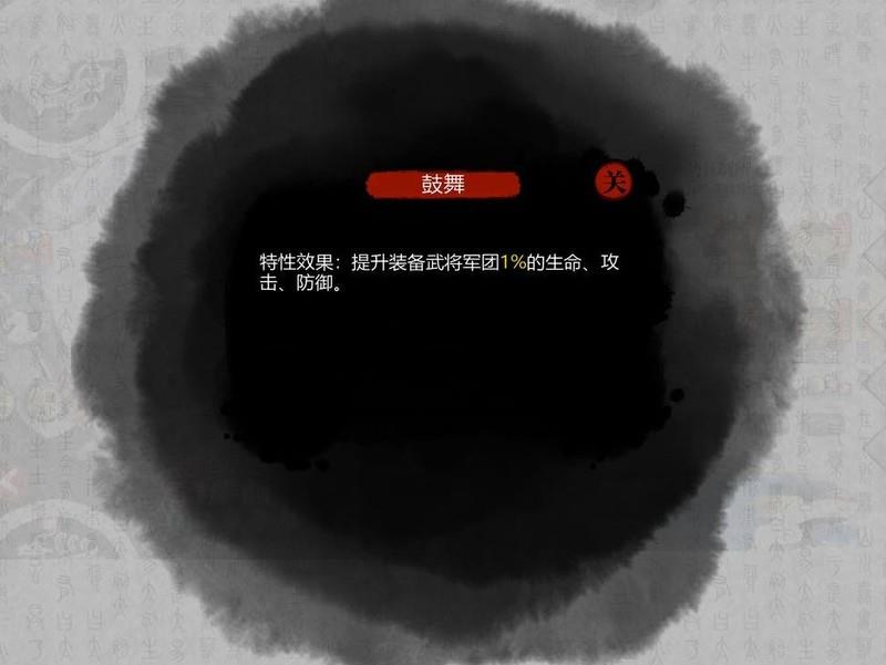 装备鼓舞词条仅含特性效果,可使武将军团生命、攻击、防御各提升1%。