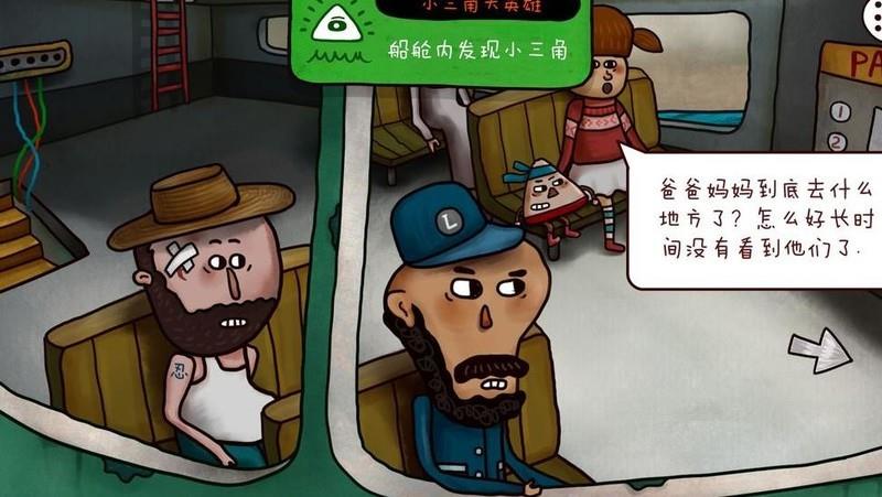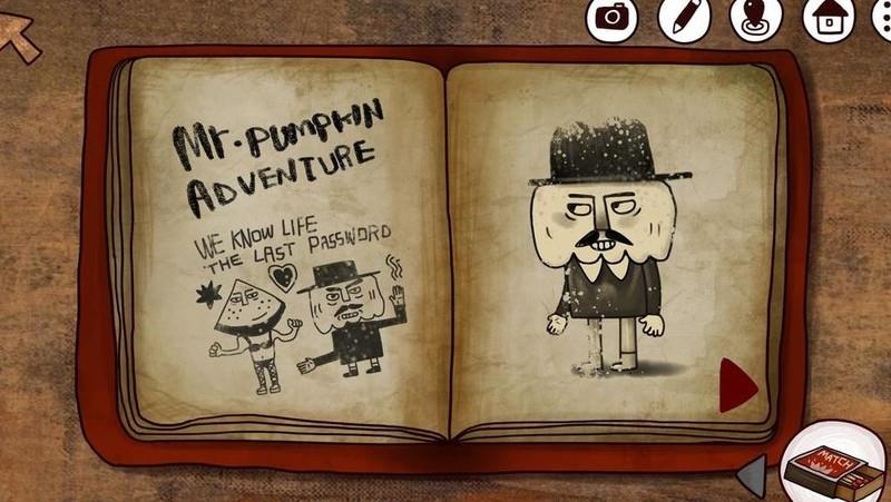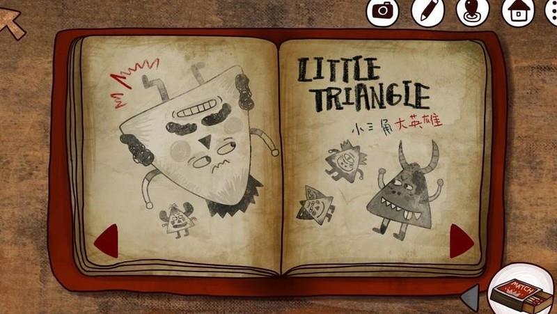 在二楼的房间中,我们翻开笔记本,前两页赫然呈现南瓜先生大冒险与小三角大英雄的插图。或许有些同学对它们尚感陌生,这里略作说明:这两幅作品出自胖布丁工作室,是他们此前推出的广受好评的游戏。独特的美术风格极具辨识度,几乎成为其标志,或许这正是属于胖布丁独有的艺术印记。