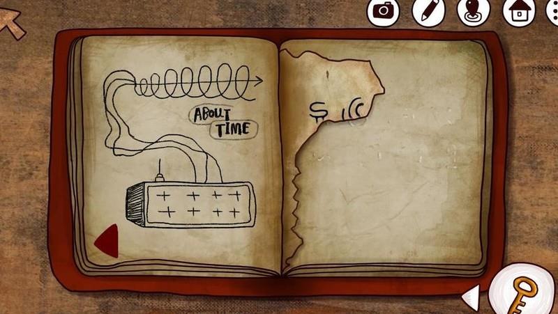 继续翻阅,可见时间机器主人留下的手写笔记。直至最后一页,在左侧绘有时间机器启动装置的页面上,醒目地写着一句About Time。