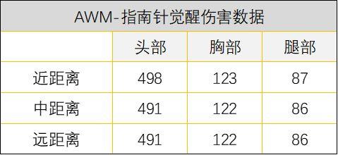 该枪械实战伤害表现可参考下表,整体延续了AWM一贯的高伤害特性,命中腿部时需两枪方可击毙目标。