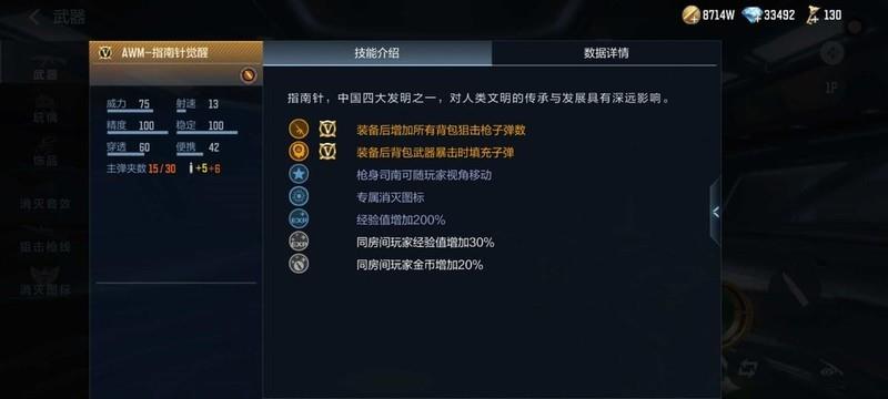 接下来看看AWM-指南针觉醒的各项属性与技能。该武器具备英雄级狙击枪的典型特性,可增加背包中狙击子弹的携带量,有效减少玩家因频繁换弹产生的紧张感。同时,当背包中的武器触发暴击时,AWM-指南针觉醒可自动补充子弹,提升持续作战能力。其最具特色的技能是枪身上的司南会随玩家视角转动而移动,增添了不少趣味性与观赏性。此外,该武器还配备了专属击杀图标、经验值加成等常见英雄级属性,增强玩家的游戏体验与成长效率,整体表现全面且富有创意。