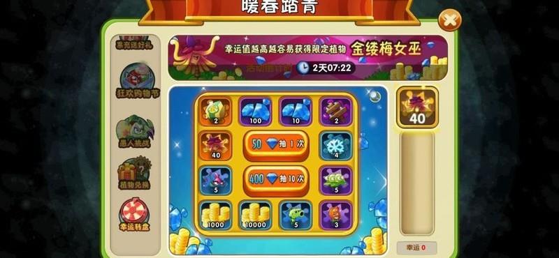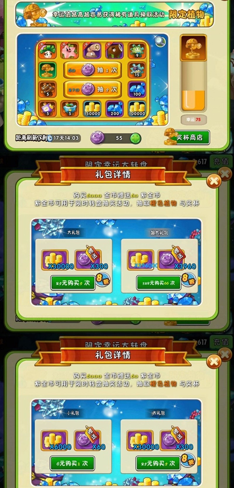 购买紫金币可用于参与抽奖,奖品包含3阶植物、奖杯、挂件碎片、钻石和金币等。奖杯可在夺宝商店兑换稀有植物。