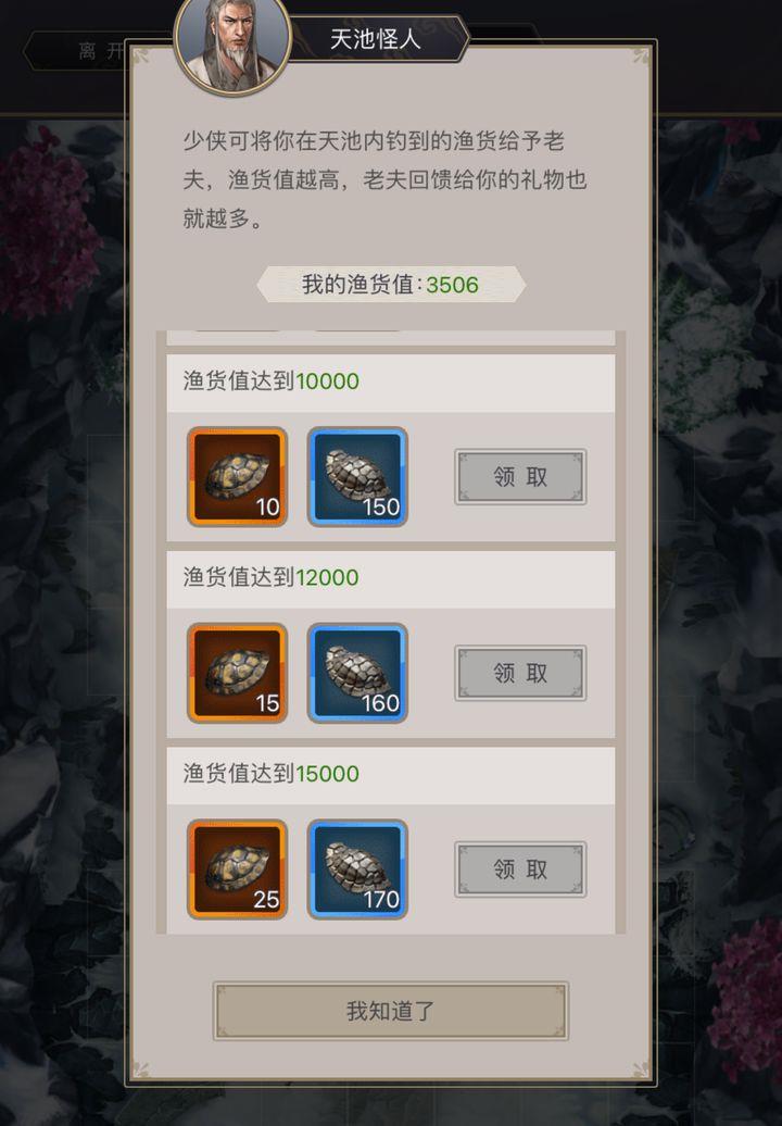 天池更新后,新加了个15000渔货的档位,跟原来的12000档比起来,等于多花3000渔货就能多拿25个龟背。这个兑换比例,比之前6000到8000、8000到10000那两档(都是2000换10个)可要划算多了。所以,以前每月习惯交8000或者10000的兄弟,现在不妨考虑一下:要么就交6000,要么干脆一口气交满15000。这么搭配着来,反而比死守着8000或10000的档位更值当。其实以前也有过类似情况,只是没这次差别这么大。