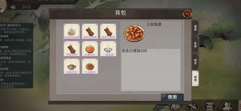 客栈可购食物,背包携带后使用,部分食物能提升100攻击与600血量,实用性较强。