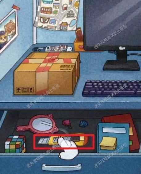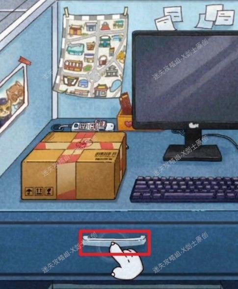 随后观察后方墙壁的提示,回到先前取得强力胶水的桌面,依照墙上线索拨动老鼠装置,顺序为右右右左左右右右右,打开抽屉即可获得罐头。