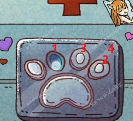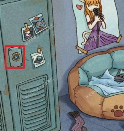 海报上的提示揭示了柜中箱子上猫肉球锁的密码线索。