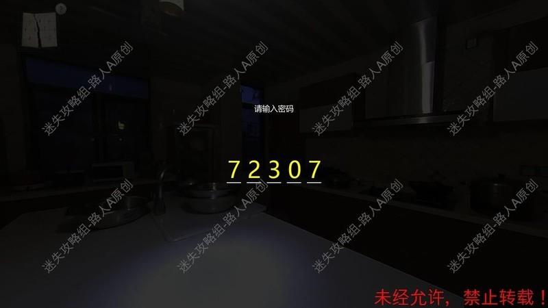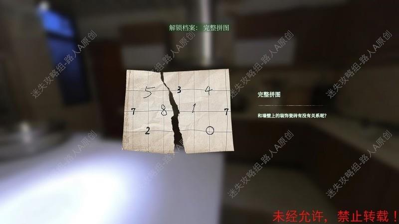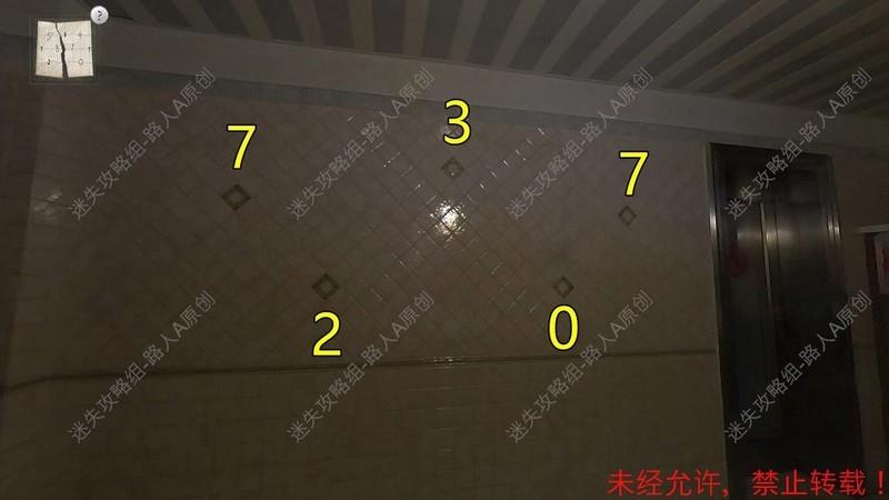 对照完整拼图与墙上的瓷砖,按瓷砖位置确定对应数字,再从左至右依次排列,最终得出密码为72307。