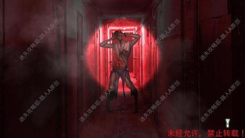 一直向前走,途中遇到怪物时用手电筒照射即可通过,无需等待怪物消失,照到后可立即继续前行。