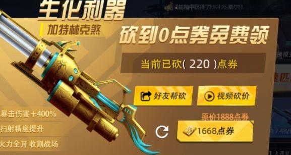 这个活动很给力,玩家可以通过邀请好友助力或看视频参加砍价,每次砍价成功都会永久降低需要的点券数量。虽然每天的助力和砍价次数有限,但只要每天坚持,价格就能一点点削减,最后甚至能把点券砍到零,免费拿到道具!活动的奖励是加特林-克煞,这把武器专为生化模式设计,伤害加成明显。基础伤害30,暴击倍率4倍,穿甲率0.7,射速95.8,移动速度系数0.65,换弹时间4.5秒,弹匣容量160发,备弹320发,精准度50,生化模式伤害提升到1.6倍。外观上,暗金色枪身配银色枪管,再加蓝绿纹路装饰,看起来霸气十足。它射速快、弹容量大,能在生化战斗中形成密集火力网,是对抗异形的绝佳神器。