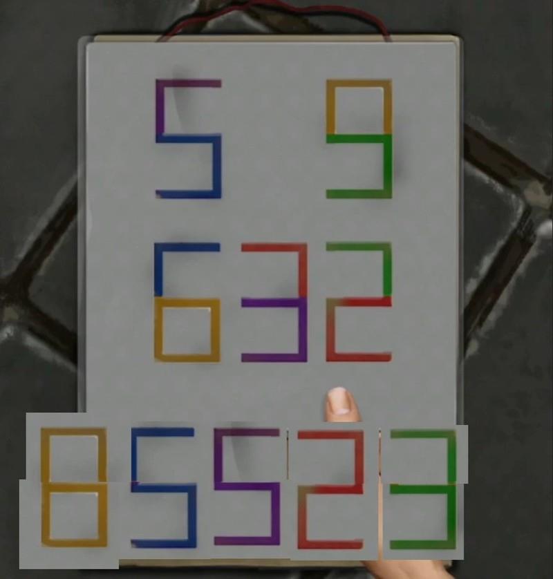 查看日历时使用了镂空卡片,发现部分数字呈现出特定图案。前方的锁需要输入黄、蓝、紫、红、绿五种颜色对应的数字组合。通过卡片分别观察,黄色区域拼合出数字8,蓝色为5,紫色也为5,红色是2,绿色则是3。由此得出密码为85523。