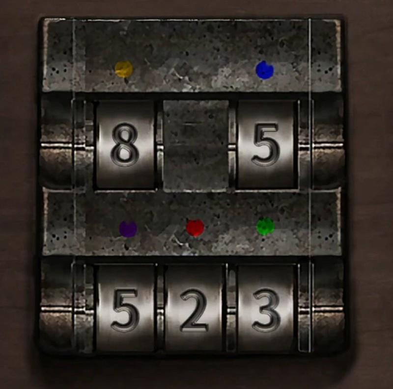 将颜色锁调整为5237,开启后取得红色阀门,完成后点击左上角的门进入后厨,此处无需进一步调查。