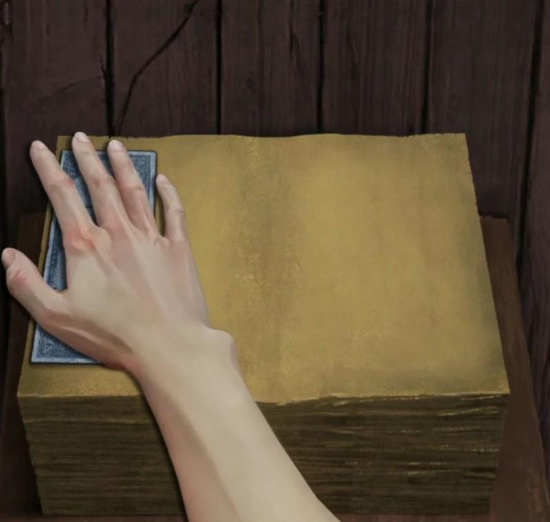 出门来到外屋,用刀撬开柜子取出汤碗,随后返回麻将馆,将小面递给右侧的纸人,换取铜钱。离开时留意小高的提示,接着前往商店,用刀划开左侧凳子上的黄纸,再用纸钱覆盖,拓印后即可获得完整的黄纸。