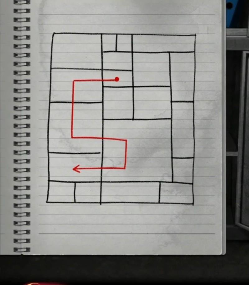 记好顺序后先退一步,点击柜子下半部分,接着按左中、右下、右中、左下、左上、右上的顺序依次点击文件夹形状的密码锁。打开后可拿到一张打印纸,上面还有一本笔记本。先不管里面的神女是不是联动彩蛋,继续往后翻,在第三页可以找到一张线索图。