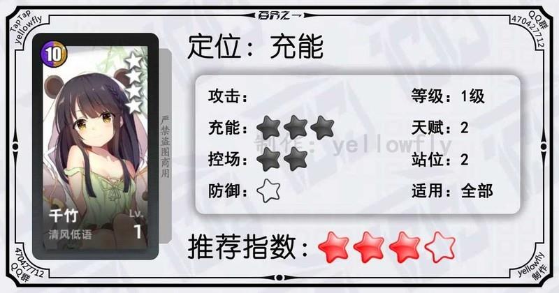 该角色在队伍无人龙型时可获得额外回合、单体高额伤害以及将厄宝石转化为毒宝石的能力,适合作为千竹队(全队无人龙型)1号位的替补。三天赋提供50%攻击宝石减伤效果,适合放在1号位承伤;二天赋每回合生成毒宝石,有助于提升充能效率。建议满级并优先开启三、二天赋。