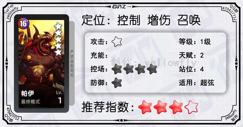 一发技能即可清空敌人护甲,辅助辉之劣爪·伊戈叠加灵力,适合超弦中高层使用,虽能量消耗高,但1级可用,推荐开启3星天赋。