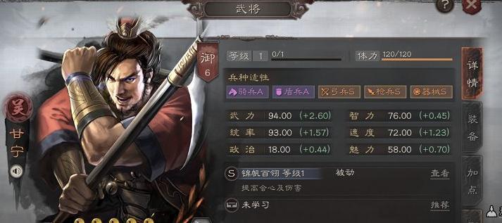 在三国志战略版里,甘宁可以通过招募或活动获得,他自带的战法“锦帆百翎”非常契合他勇猛的特点,不仅能大幅提高暴击率,还能充分利用队友的增益效果提升伤害。只要合理搭配辅助和增益类战法,甘宁就能成为队伍中的核心输出,担任主力位置。