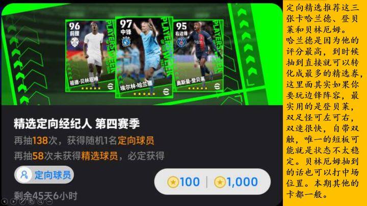 本期球员中哈兰德评分最高,抽中后能兑换大量精选券。如果组建边锋阵容,登贝莱更为实用,他双足均衡、速度快,还拥有双触技能,不过状态略显不稳。贝林厄姆也可用于中场。其他球员整体表现一般。