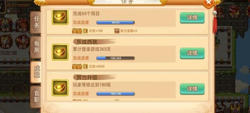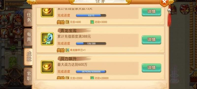 第一阶段只需跟随主线任务推进,在完成主线过程中,装备方面仅进行强化与升品,暂不开启锻造系统;角色培养则按正常节奏升级、升星,但暂时不要进行进阶操作。策略技能优先升级冰莽计,只需升至1级冰龙即可,因其附带冰冻效果,遇到难以击败的关卡时可利用冰龙控场,有效缓解战斗压力。当前版本主线推进顺畅,一般不会出现严重卡关情况。当角色总战力达到100万时,将解锁成就奖励——一阶白虎武器宝箱,有机会获得一件白虎系列装备。由于前期资源有限,非氪金玩家需谨慎选择装备类型:建议零氪玩家优先选择白虎刀,因前期主力输出为张辽,白虎刀降低5速的特性可确保其在队伍中吃到全部增益状态,发挥更大作用;待后期典韦升至五星后,再将其作为核心输出过渡。充值108档位的玩家则推荐选择白虎枪,适配乐进或赵云使用,并结合青龙宝库中的青龙斧持续培养典韦。若推进主线时遭遇瓶颈,可前往玄武洞刷取王八怪提升实力,循环往复直至顺利通关所有主线内容,支线任务可视个人喜好选择性完成。第一周目标完成后,应立即着手收集夜照玉狮子(一匹橙色马)的相关碎片,并开启地图上全部宝箱,包括两个隐藏宝库,具体碎片位置可参考相关资料中的详细标注。