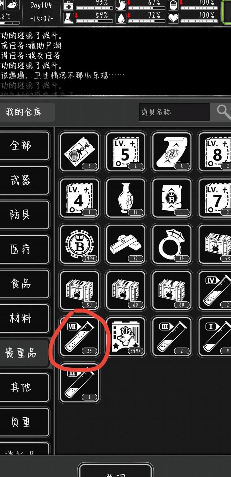 击杀虫群主宰后,尽管场上仍有触手尸爵,我选择立即撤离。掉落物未见血液,但仓库中的七血数量却从22增至23。