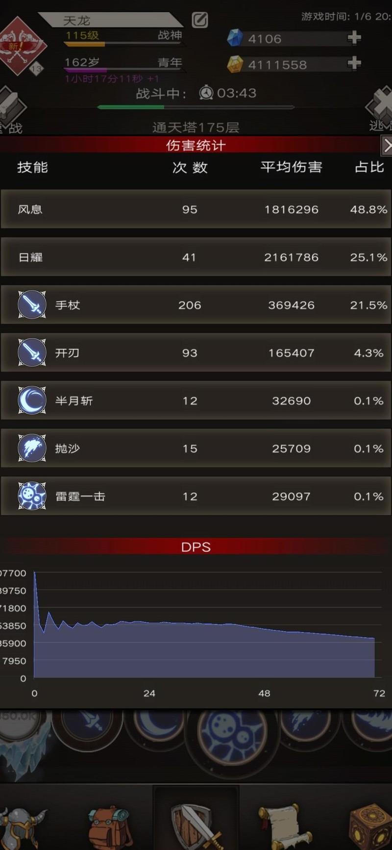 风息流,顾名思义是以风息为核心输出手段的流派,主要依赖满层闪避与阴寒之息提供的护盾来维持生存能力。其最大优势在于无需过度追求暴击、爆伤、属性伤害及增伤等资源消耗较大的词条,仅凭较低培养成本即可实现高效输出。不过,在敌人减伤较弱的情况下,该流派的优势体现得并不明显。目前展示的是通关175层时的装备配置与伤害分布图,披风尚未完成洗练与铭刻,治疗类铭刻也未装配,武器等级为16级。即便如此,这套成型度一般的装备已能顺利通关,足见其整体强度具备相当水准。