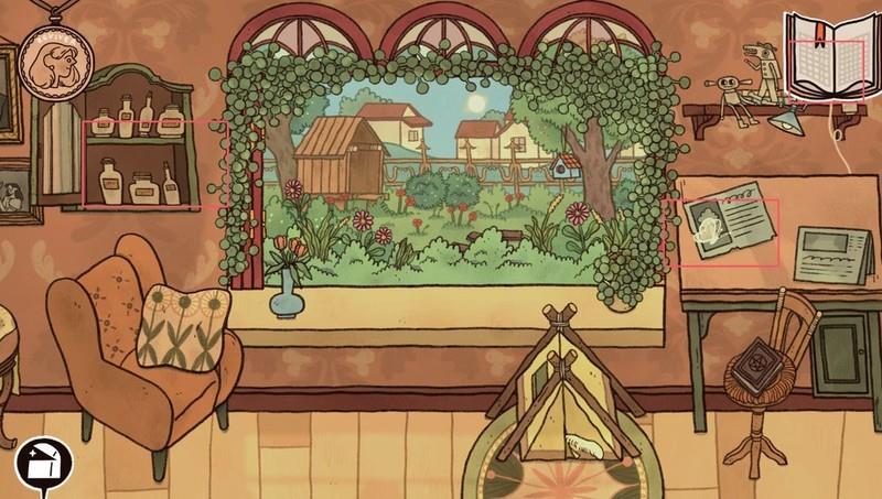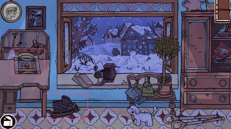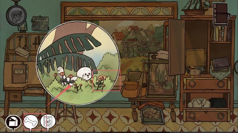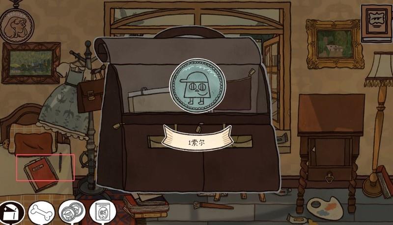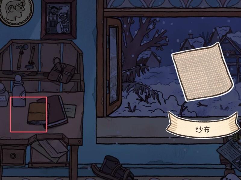 点击窗边小狗,捡起坏捕兽夹,查看日记更新后,拿走桌上纱布。