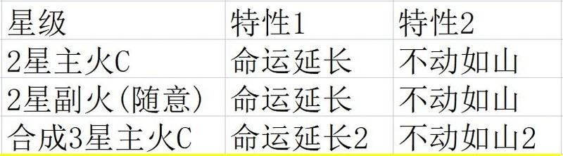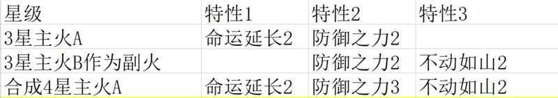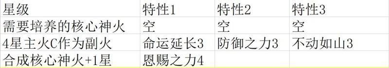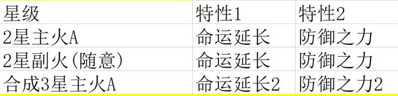 随意选取两个2星黄色神火,刷出命运延长与不动如山特性后即停,无需刷满全部特性。随后将主火C与副火融合,最终使3星主火C同时拥有2级命运延长和2级不动如山。