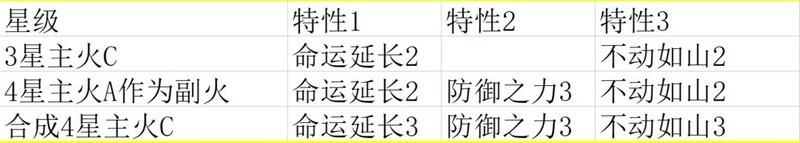 主火C在四星时即可完全解锁三级命运延续、防御强化与稳如泰山效果。